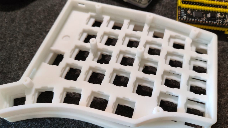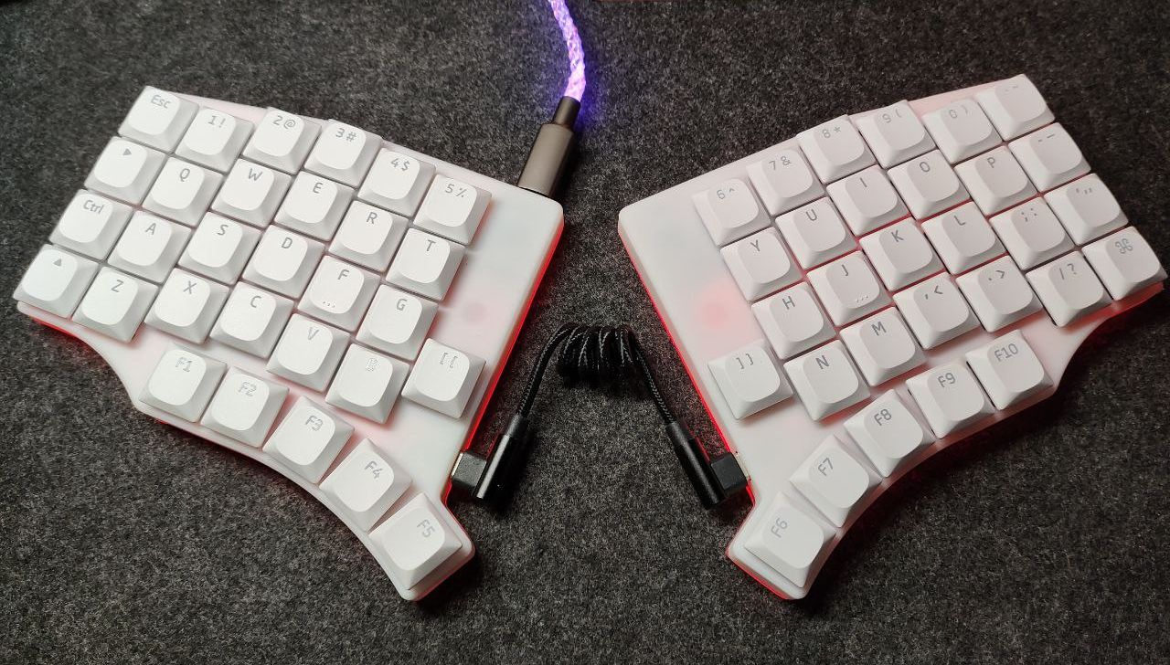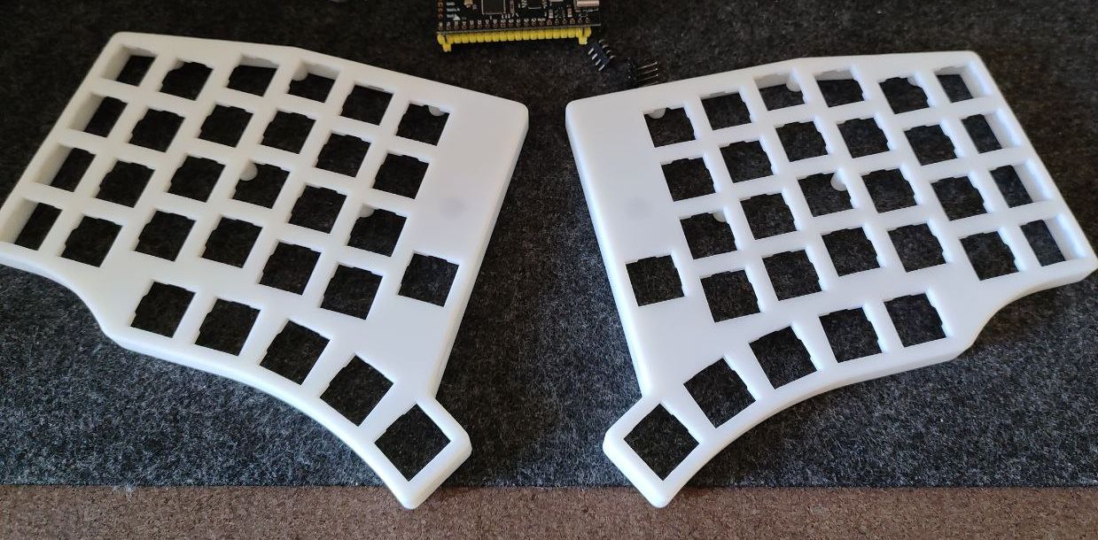 Custom 60 key handwired split keyboard case. The left and the right sides are different. The bottom parts are identical, if you need the bottom parts order two the same bottom parts. In my case bottoms are cut by hands from acrylic sheet. Case is suitable not only for low profile switches, but also for full size ones. Controllers are Waveshare RP2040-Zero. Firmware is KMK. For underglow added few pieces of WS2812 RGB stripe.